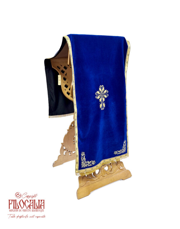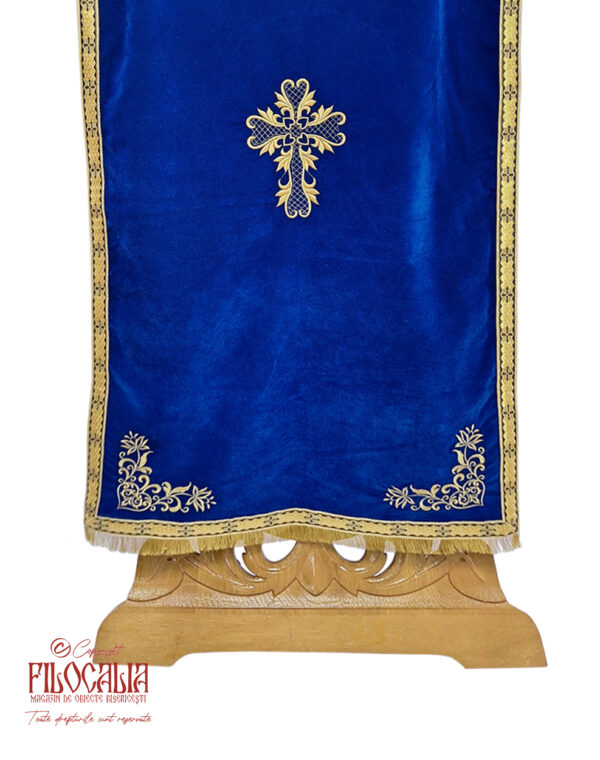 Acoperământ pentru analog, din catifea albastră, brodat cu decorațiuni ornamentale. Se poate realiza și la comandă. Dimensiuni: 55x204cm