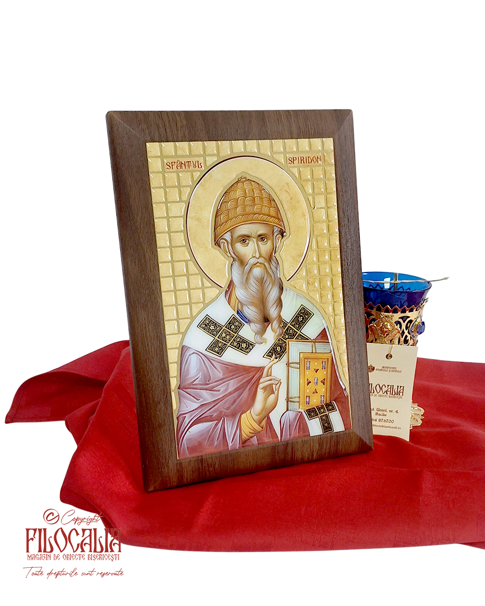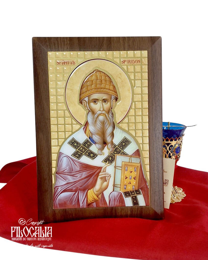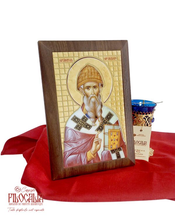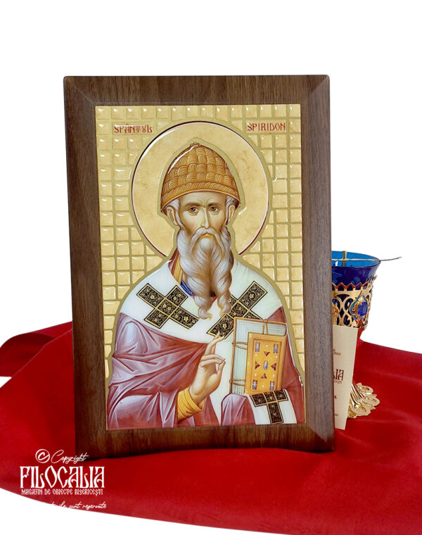 Icoană reprezentând pe Sf. Spiridon, executată în tehnică mozaic, ramă din lemn.