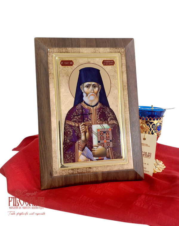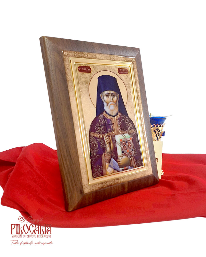 Icoană reprezentând pe Sf. Cuv. Mc. Visarion de la Lainici, executată în tehnică mozaic, pe fundal auriu, ramă din lemn.