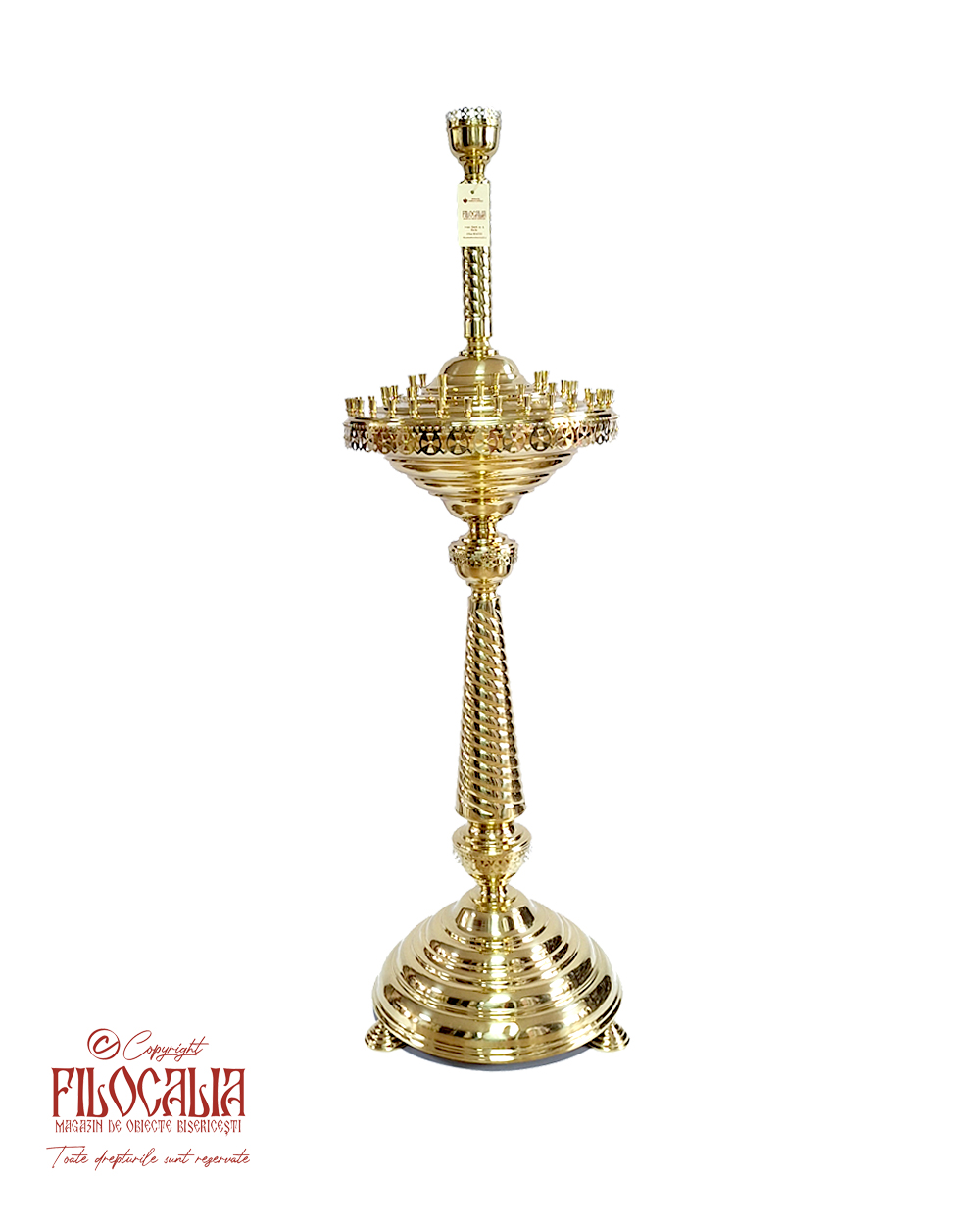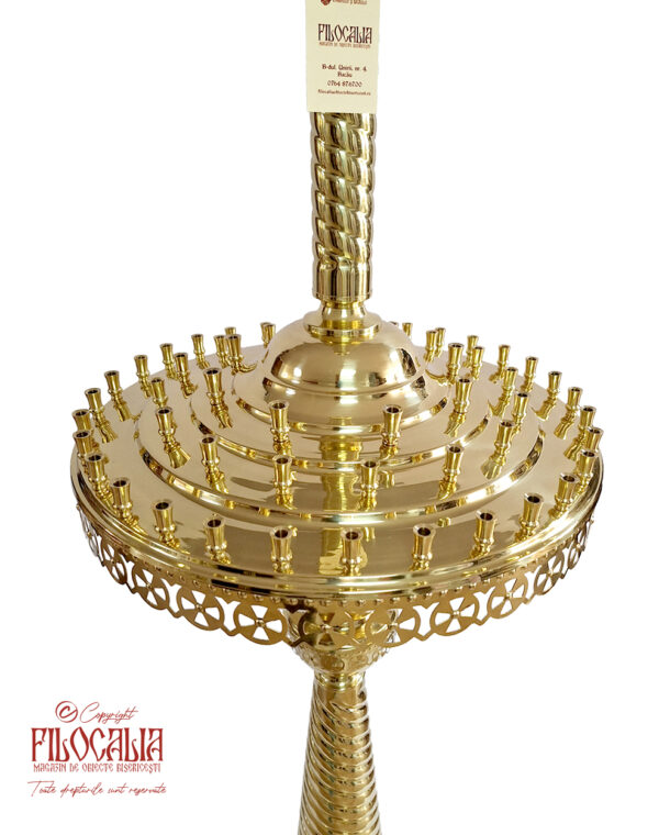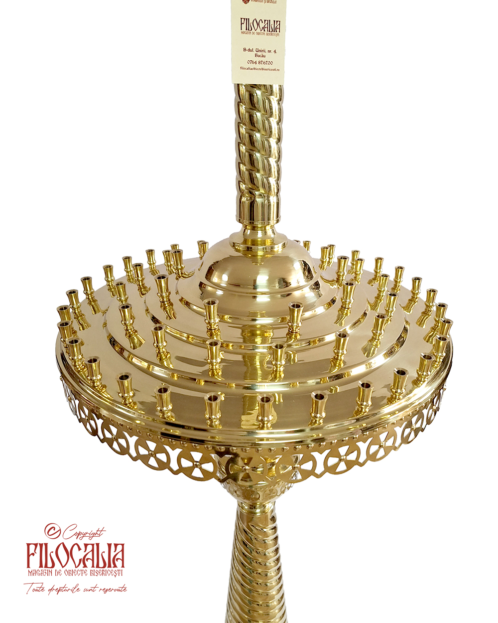 Sfeșnic metalic din alamă, cu picior, 56 lumânări și 1 candele. Înălțime: 156cm, bază: 50cm.