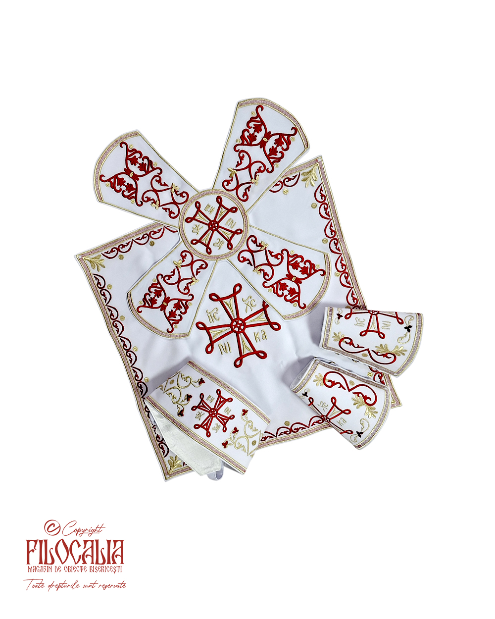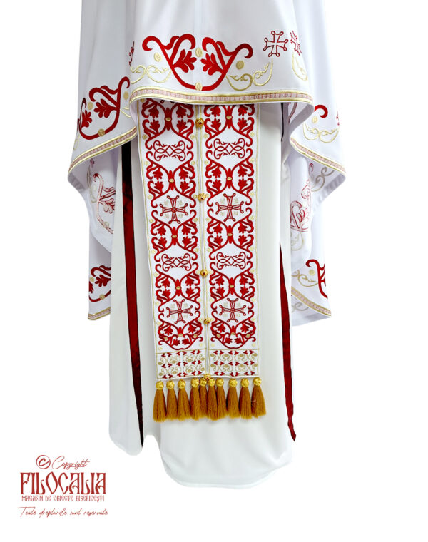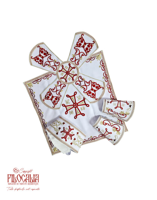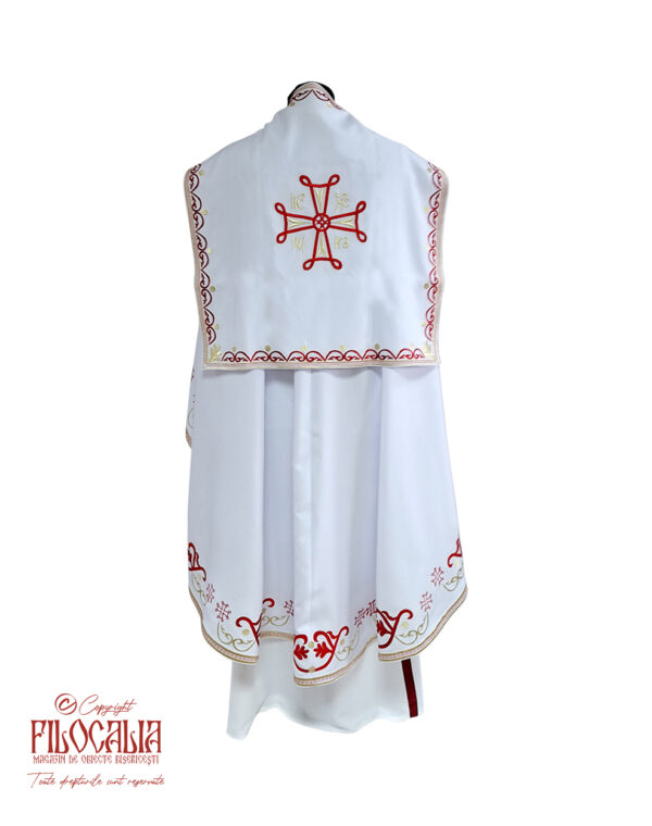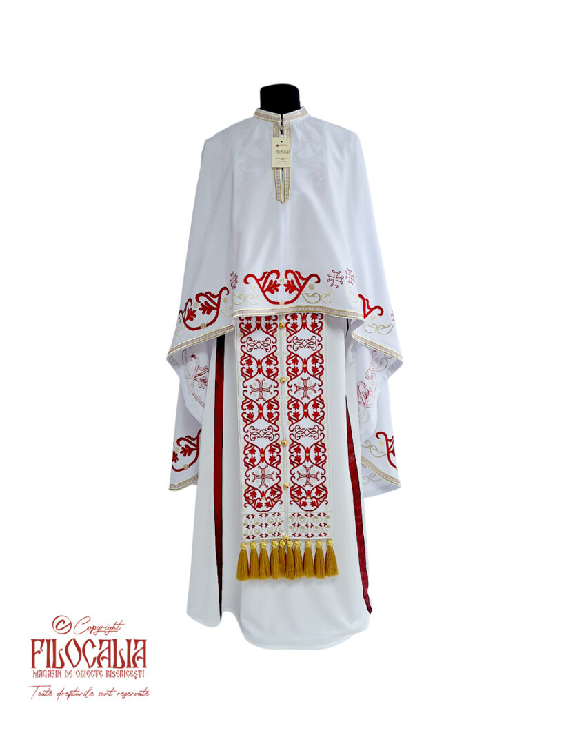 Veșmânt preoțesc alb, brodat cu decorațiuni ornamentale roșii și aurii. Veșmântul cuprinde acoperămintele pentru Sfintele Vase, mânecuțe, brâu și bederniță. Se poate realiza și la comandă.