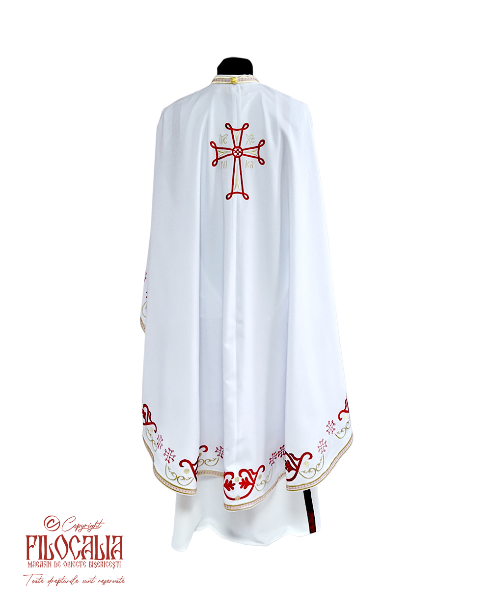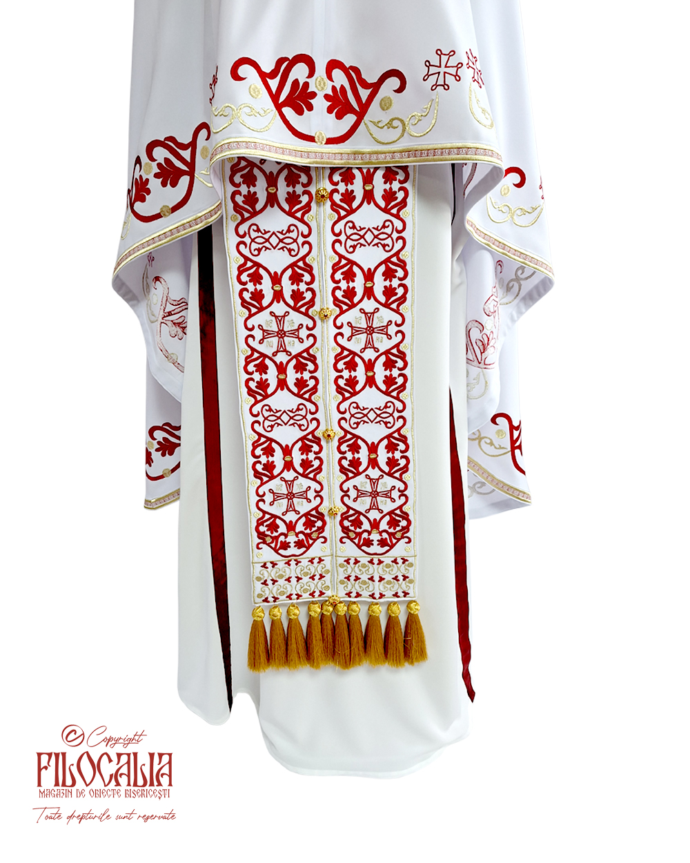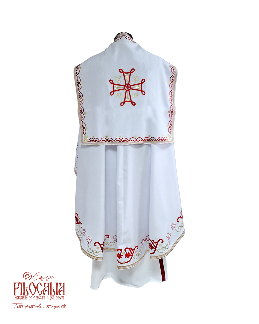 Veșmânt preoțesc alb, brodat cu decorațiuni ornamentale roșii și aurii. Veșmântul cuprinde acoperămintele pentru Sfintele Vase, mânecuțe, brâu și bederniță. Se poate realiza și la comandă.